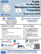 Join us at MiMutual Mortgage for a 1-hour CE course covering the new FinCEN Reporting Rule and how it directly impacts you as a real estate agent.